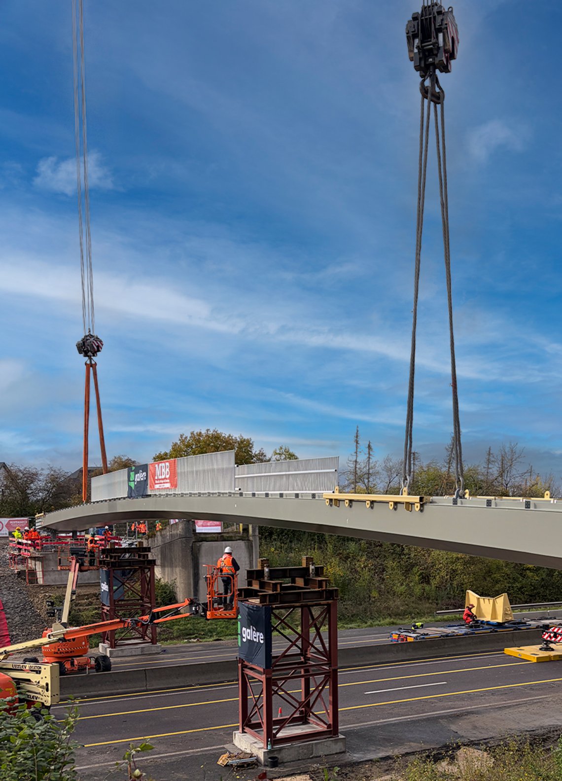 L’opération d’installation s’est déroulée le samedi 25 octobre 2025, profitant de la fermeture complète de l’A3 entre Gasperich et Bettembourg. Le matin, l’ancienne passerelle a été déposée et évacuée vers la zone douanière de Zoufftgen pour démantèlement. L’après-midi, la nouvelle structure a été mise en place grâce aux deux grues mobiles, dans une manœuvre spectaculaire parfaitement coordonnée.