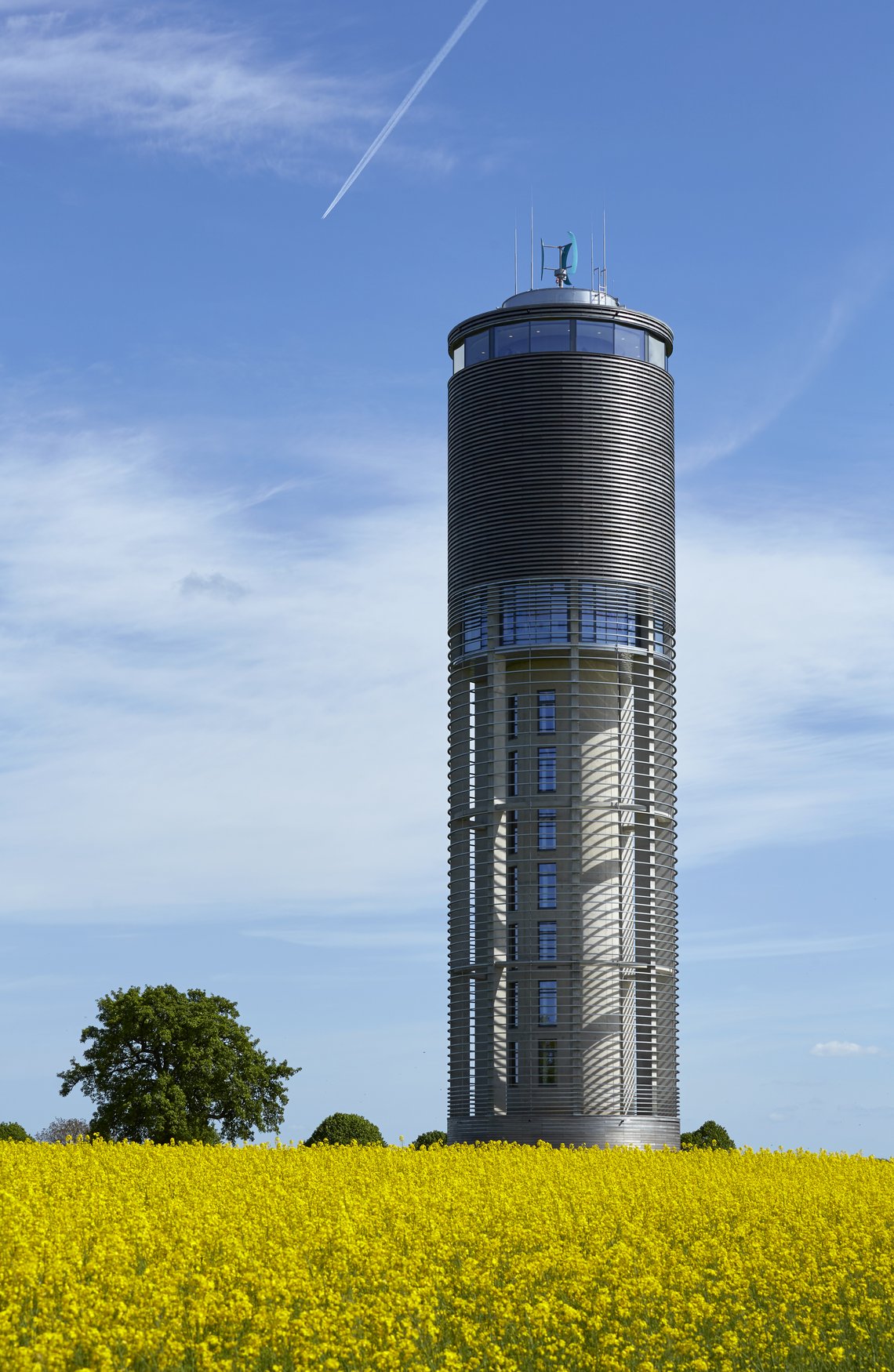 Le bois habillant les façades adoucit la présence de la tour et l’ancre harmonieusement dans son environnement. Enfin, l’acier inoxydable vient sublimer la couronne supérieure, reliant avec finesse les différents volumes de la structure.