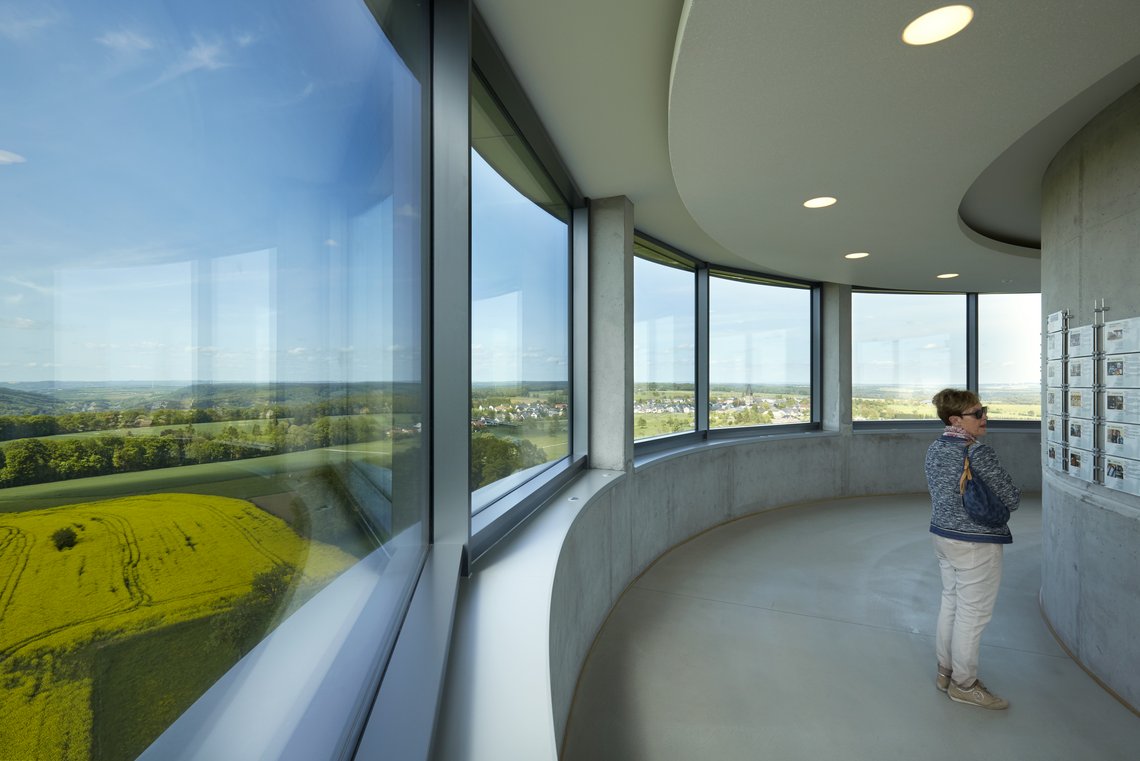À 50 mètres de hauteur, une plateforme panoramique entièrement vitrée accueille le public et offre une vue à 360° sur le paysage pittoresque du Müllerthal. À 32 mètres, un étage didactique invite les jeunes à découvrir une exposition permanente consacrée à l’eau et à la géologie. Le rez-de-chaussée, quant à lui, propose un espace d’accueil convivial et accessible à tous. L’accès aux différentes plateformes se fait aussi bien par un ascenseur que par un large escalier hélicoïdal, garantissant une visite fluide et agréable.