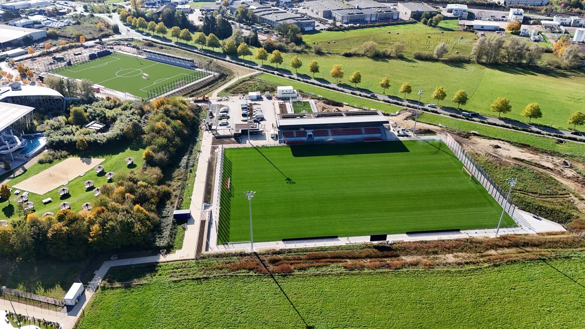Démarrés en mars 2023, les travaux du nouveau complexe – cofinancés par le ministère des Sports et la commune de Strassen – comprenaient la réalisation de deux terrains de football, à savoir un terrain en gazon hybride et un terrain en gazon synthétique, d’une tribune couverte en structure mixte béton-métal et de gradins totalisant 348 places assises. Le projet incluait également un terrain multisports, des vestiaires, une infirmerie, une salle de presse, une billetterie, une buvette moderne, un espace VIP, un carport muni de panneaux photovoltaïques couvrant les 90 emplacements de parking (prévu pour le printemps 2026), ainsi que les aménagements extérieurs avec renaturation.