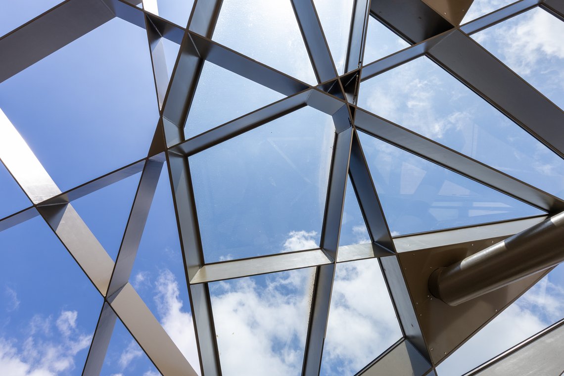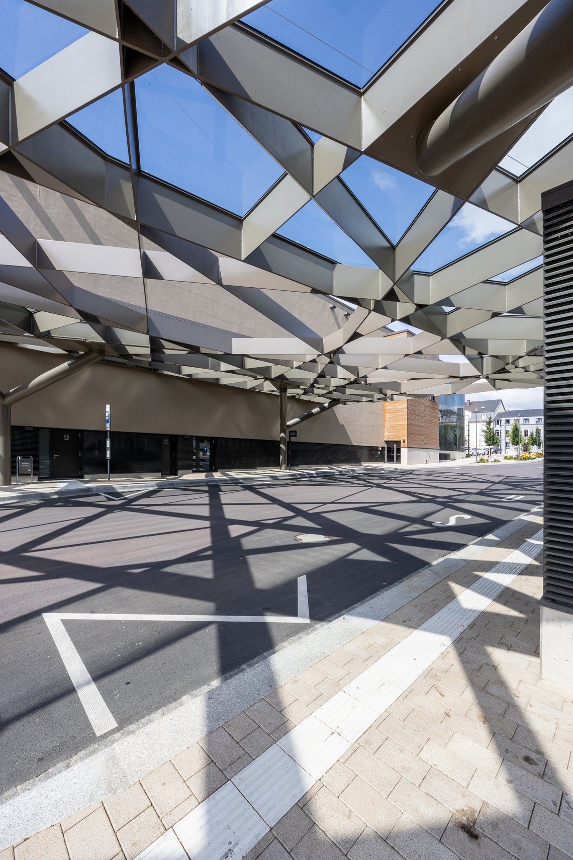 Le souhait du conseil communal était d’intégrer la nouvelle gare routière harmonieusement au centre culturel, afin d’assurer une cohérence architecturale et d’améliorer le confort des usagers. L’ensemble est désormais couvert par un toit en verre de 532 m² (28 m x 19 m), reposant sur une structure en acier angulaire. Ce toit se compose de 110 vitres géométriques irrégulières, pesant au total 33 tonnes, et réparties sur un réseau de treillis complexe. Cette structure spectaculaire protège les voyageurs des intempéries, tout en apportant une touche contemporaine et lumineuse à l’espace public.