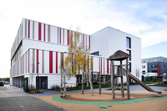 Conçu dans une démarche durable, le bâtiment intègre plusieurs dispositifs environnementaux : une installation photovoltaïque en toiture couvrant environ 8 % des besoins énergétiques de l’école, une toiture végétalisée, des systèmes de chauffage à faibles émissions ainsi qu’un système de récupération des eaux de pluie.