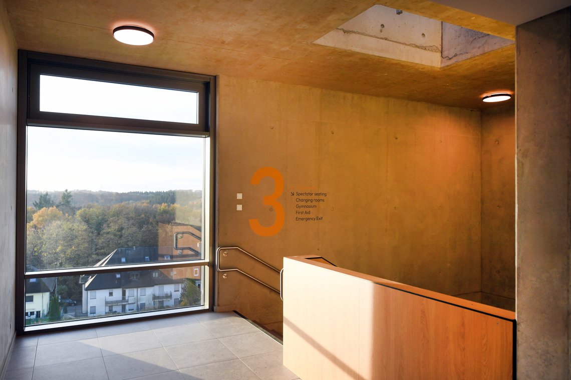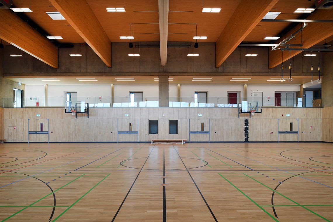 La construction adopte une approche hybride associant béton armé et bois. Le socle et les éléments porteurs principaux sont réalisés en béton apparent, tandis que la structure de la salle de sport privilégie le bois, avec des éléments en CLT (cross laminated timber) et des poutres en lamellé-collé, apportant chaleur et qualité spatiale à l’intérieur. Les matériaux sont laissés visibles et complétés par des finitions soignées, telles que des habillages acoustiques, du parquet industriel et des touches colorées. Leur sélection répond à des exigences élevées de durabilité, assurant une grande résistance à l’usure, un vieillissement qualitatif dans le temps, ainsi qu’un entretien simplifié, tout en limitant leur impact environnemental.