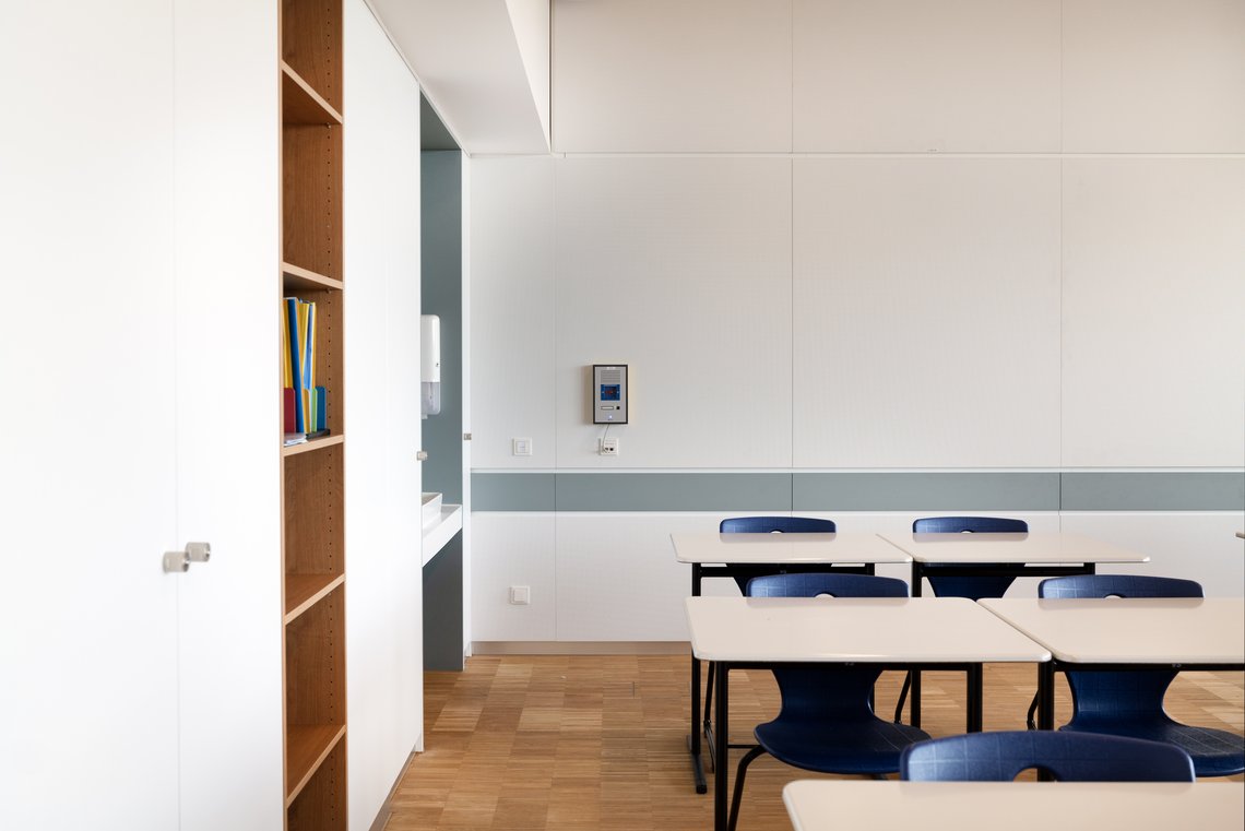 Implanté à l’entrée du site scolaire, le projet se développe au-dessus d’un nouveau parking de 50 places situé au rez-de-chaussée. Cette implantation sur pilotis permet de préserver les flux de circulation entre les différents espaces du campus, tout en intégrant harmonieusement le bâtiment dans son environnement urbain.