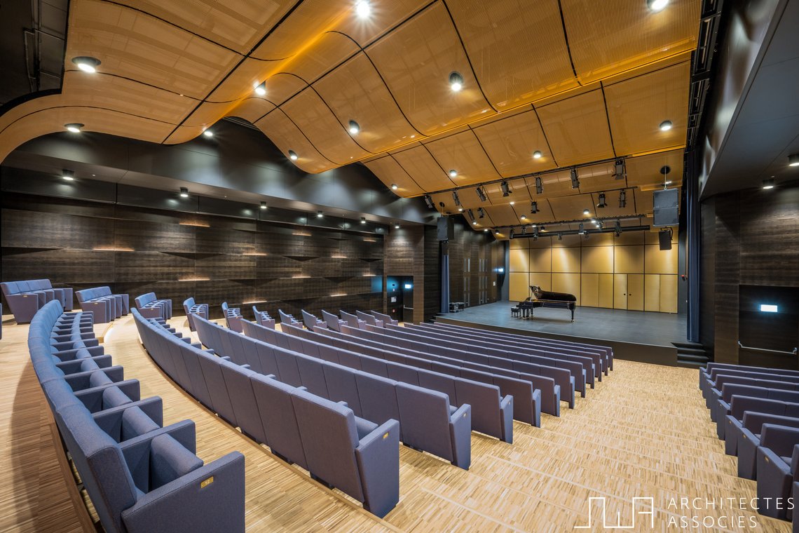 L’école accueille un programme pédagogique complet, incluant plusieurs locaux de solfège, salles de percussion et espaces dédiés aux cours instrumentaux. La salle de concert, pouvant accueillir jusqu’à 300 spectateurs, constitue le cœur du complexe. Elle est reliée à un foyer central qui facilite la circulation et la rencontre entre élèves et visiteurs. La zone administrative comprend bureaux et salles de réunion, tandis que le sous-sol, couvrant l’ensemble de la parcelle, offre 97 places de parking et des espaces logistiques connectés à la scène par un monte-charge. Des vestiaires pour solistes et des loges de contrôle d’accès complètent les installations.