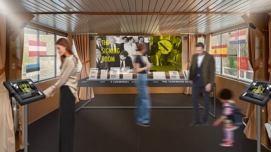 Le bateau rénové a été pensé comme une extension vivante du Musée européen de Schengen, lui aussi réaménagé pour l’occasion, avec la création d’un nouveau quai d’accostage durable. À bord, les visiteurs découvrent une reconstitution immersive de la salle de signature de 1985, leur permettant de revivre ce moment clé de l’histoire européenne.